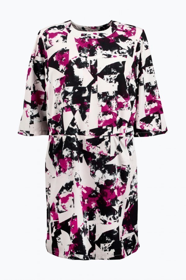 Junarose jrGaron -mekko kangasta. Pehmeä trikoovuori. Miellyttävä, väljä malli. 3/4-pituiset hihat. Pyöreä pääntie, jossa leveä reunus. Halkio ja kaksi nappia niskassa. Poikkileikkaus edessä lantiolla. Kaksi upotettua taskua. Pituus n. 102 cm koossa S. 100% polyesteriä Vuori: 100% polyesteriä Istuvuus: regular Hienopesu 30°.