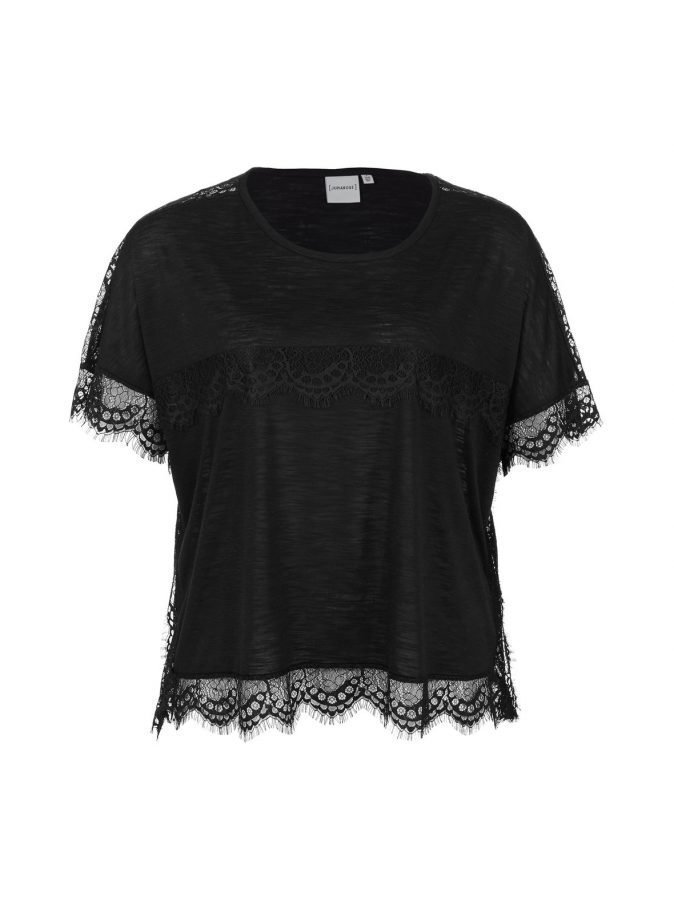 Lyhythihaista puseroa koristavat viehättävät pitsiyksityiskohdat. Pääntie on avarahko. Pusero sopii yhdistettäväksi esimerkiksi kapealinjaisen alaosan kanssa.