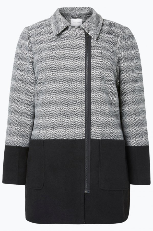 Junarose Roda -takki huopakangasta. Kiiltävä vuori. Suora malli. Kuviollinen yläosa, poikkileikkaus lantiolla ja yksivärinen alaosa. Vetoketjusuljenta hieman sivulla. Kaksi päälleommeltua taskua alhaalla. Pituus n. 85 cm koossa S. 90% polyesteriä, 10% elastaania Vuori: 100% polyesteriä Istuvuus: regular Kemiallinen pesu.