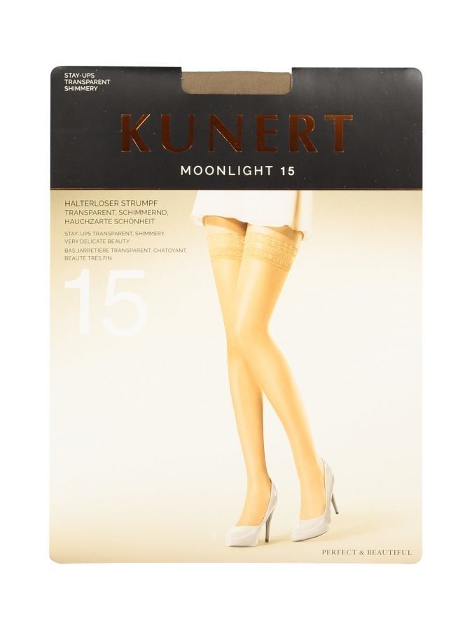Kunert Moonlight 15 Stay up -sukissa on himmeä kiilto ja hyvä istuvuus. Sukissa on tasosaumat ja kannat on muotoiltu. Sukat sopivat mainiosti sandalettien ja peep toe -kenkien kanssa käytettäväksi, koska sukkien kärkeä tai kantaa ei ole vahvistettu. Sukkien yläreuna on kaksoissilikoniset leveät pitsireunat.