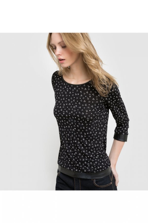Pusero, jossa 3/4-pituiset hihat. Nahkajäljitelmäreunus pääntiessä, helmassa ja hihansuissa. Takana halkio, joka suljetaan nahkajäljitelmärusetilla. Kolmiokuvio. Materiaali ja detaljit Materiaali: 100% viskoosia, reunat 70% polyesteriä, 30% polyuretaania. Pituus 60 cm. Tuotemerkki: R edition. Hoito-ohje Konepesu 30°. Pesu samanväristen kanssa.