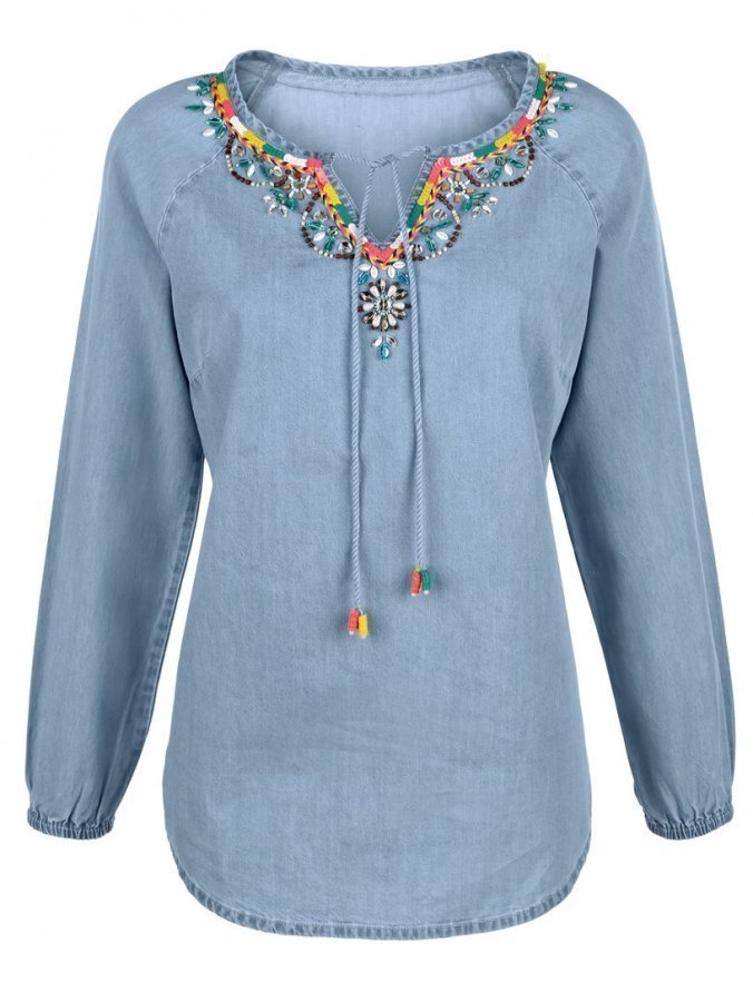 Laura Kentin tunika, jonka pääntien reunassa on yksityiskohtainen somistus. Farkkumateriaali korostaa hyvin tunikan rentoa ilmettä.
