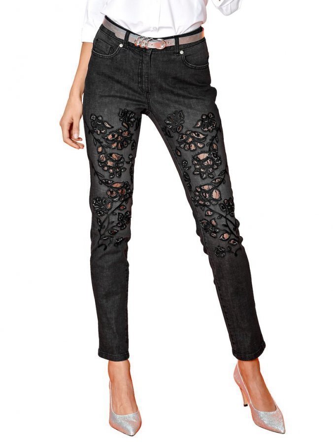 Trendikkäät farkut, joissa on kukka-aiheinen kuviointi sekä pitsi- ja strassikivikoristeita. Klassinen 5-taskumalli. Tyylikkäät kulutukset.