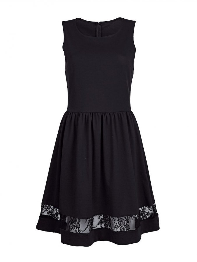 Elegantti ja naisellinen mekko, jossa on helmaa kohti levenevä hameosa. Helmassa on istutettu pitsikaitale. Leveät olkaimet ja pyöreä pääntie.