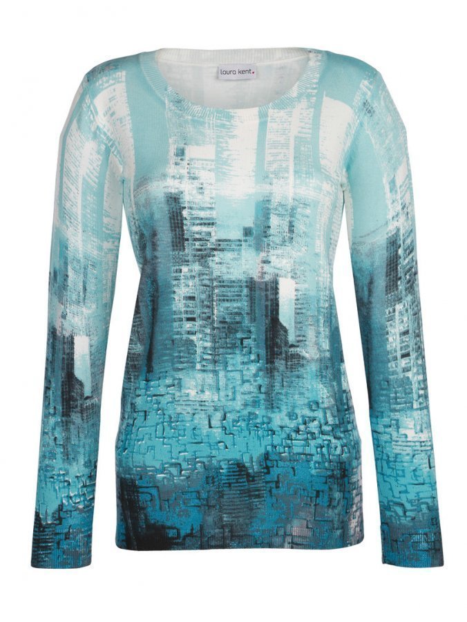 Pitkähihainen neulepusero, jossa on pyöreä pääntie ja muodikas painokuosi. Helmassa koristeelliset joustinneuleresorit.