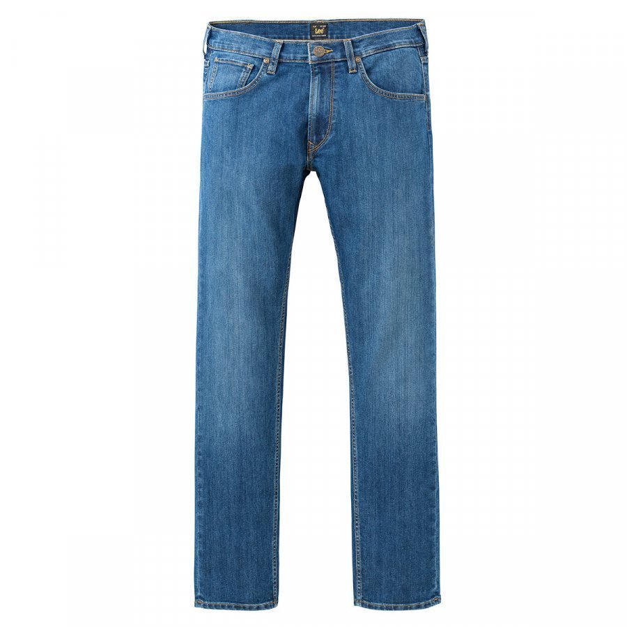 Vaaleansiniset farkut merkiltä Lee. 70% puuvillaa, 30% elastomultiesteriä – Suora malli – Normaalikork. vyötärö.