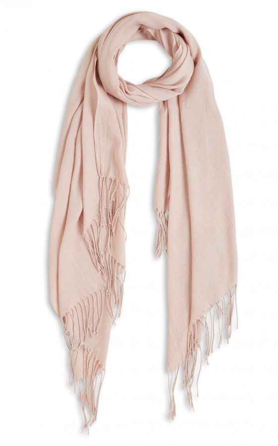 Suuri huivi, joka on valmistettu pehmeästä kierrätyspolyesterista ja jossa on hapsut.