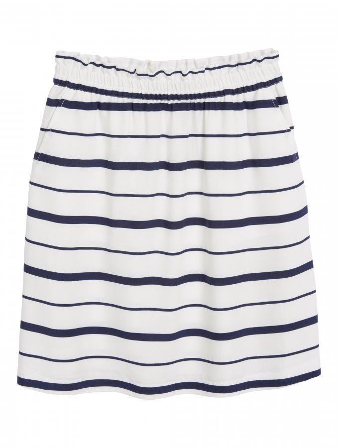 Pehmeässä seilorihenkisessä hameessa on kivoja yksityiskohtia. Paperipussivyötärö, etutaskut ja miellyttävä joustava vuori.