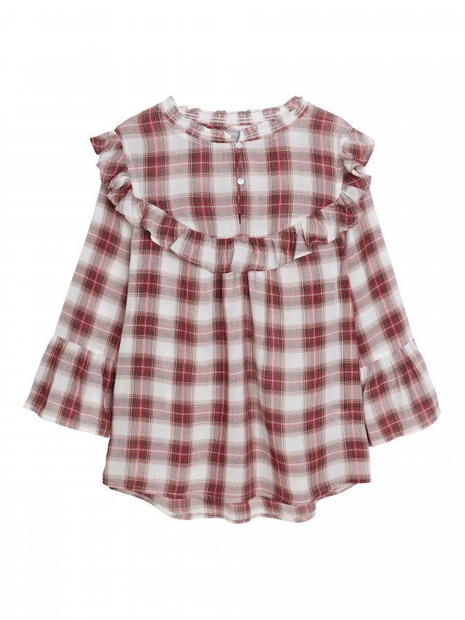 Pehmeä ja ilmava viskoosipusero, jossa on klassinen ruutukuvio ja tyylikkäät röyhelöt ja kellohihat. Luo trendikäs look yhdistämällä farkkuihin.
