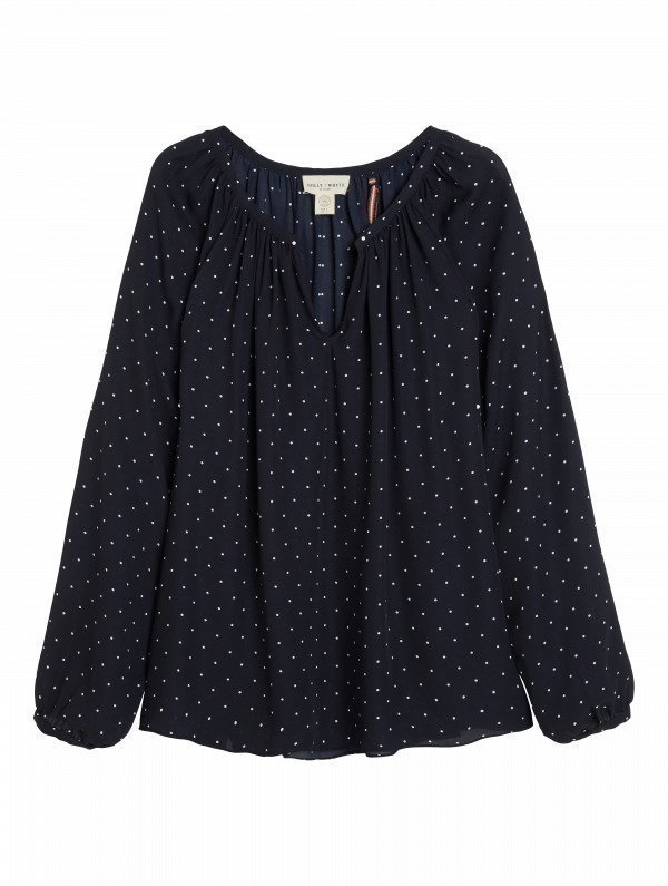 Pitkähihainen, suoranmallinen sifonkipusero, jossa on hieno pilkkukuviointi. Hillitty halkio pääntiessä. Hihansuiden napit kullanväristä metallia. Takaa hieman pidempi.