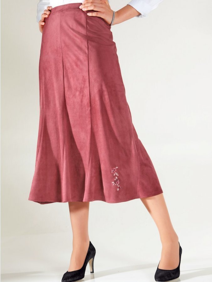 Veluurinahkajäljitelmästä valmistettu hame, johon ihastut varmasti! Suloisen pehmeä materiaali tuntuu ihanalta ihoa vasten. Miellyttävä joustovyötärö ja edestä kiinteä vyötärökaitale. Hulmuava malli. Etuosassa pieni kirjonta. Sopii täydellisesti alppityylisen yläosan kanssa.
