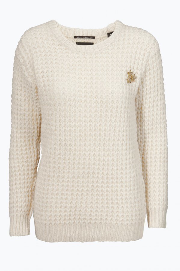 Maison Scotch -neulepusero paksua kuvioneuletta. Hieman vartalonmyötäinen malli. Irrotettava rintakoru, jossa tähtiä ja strasseja. Paksuvakoinen resori pääntiessä, hihansuissa ja helmassa. Pituus n. 62 cm koossa M. 69% akryyliä, 18% polyesteriä, 9% mohairia, 4% polyamidia Istuvuus: regular Käsinpesu.