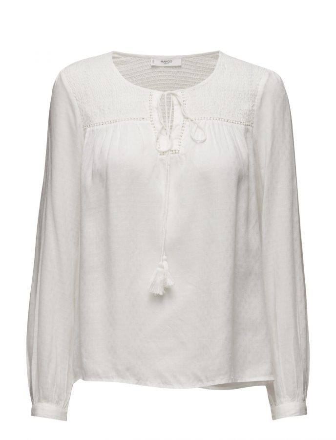 Mango Valmistusmateriaali: 100% Polyesteri. APPLIQUE: 100% Puuvilla. BLOND LACE: 100% Puuvilla. Väljä malli Smokkipoimutettu pääntie