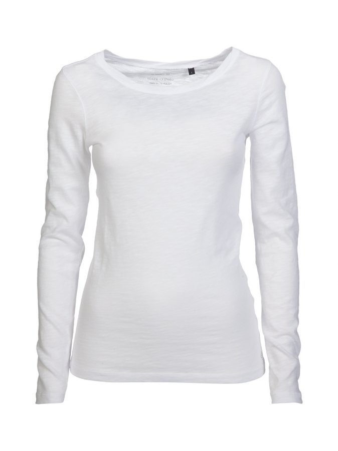 Pitkähihainen paita on ohutta ja läpikuultavaa puuvillaneulosta, jossa erottuu kevyttä raidoitusta. Joustavan neuleen pääntien resorissa on laskostusta. Helmassa on pieni logopainatus.
