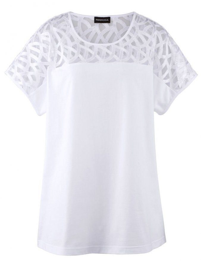 Kesäinen paita. Hartiaseudulla, hihoissa, dekolteella ja yläselässä läpikuultavaa pitsiä. Pyöreä pääntie ja holkkihihat. Materiaali puhdasta puuvillaa.