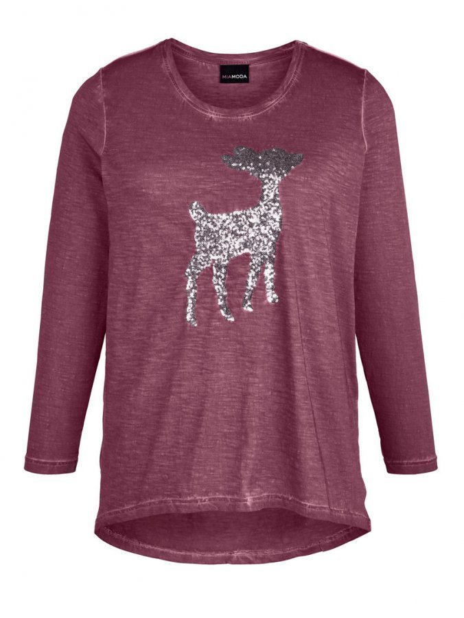 Pitkähihainen paita, jossa soma paljettikuvio sekä pyöreä pääntie. Helma on takaa pidempi kuin edestä. Puhdasta puuvillaa, joka tuntuu mukavalta päällä.