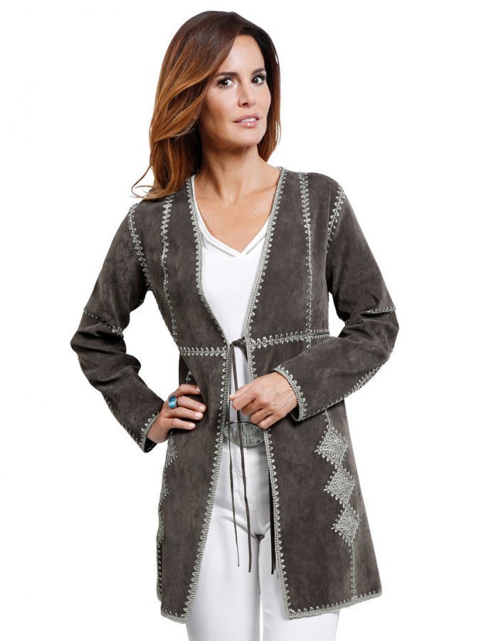 MONA-malliston mokkanahkajäljitelmästä valmistettu jakku, jonka folklore-tyyli sekä veluurikuosi tekevät vaikutuksen. Saumojen, reunojen sekä jakosaumojen väreiltään sointuvat pitsikirjonnat antavat jakulle vaikuttavan ilmeen. Rento ja avoin malli voidaan sulkea solmittavalla nauhalla. Vuoriton malli on käytössä erittäin kevyt. Hieman pidemmän, takkimaisen jakun leikkaus ja design täyttävät korkeimmatkin laatuvaatimukset.