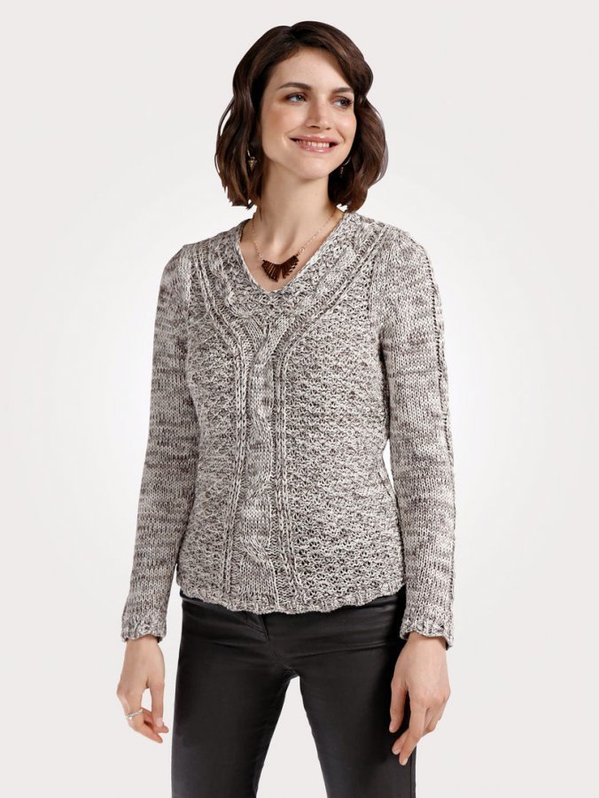Tyylikäs MONA-merkkinen neulepusero, jonka etupuolella kohokuvio- ja palmikkoneuletta. Selkäpuoli sileää neuletta. Hihat kohokuvioneuletta. Harmonisen väristä, laadukasta meleerattua lankaa. V-pääntiessä naisellista pitsineuletta. Hihansuut ja helma aaltomaiset. Miellyttävän tuntuista, helppohoitoista puuvillasekoitetta.