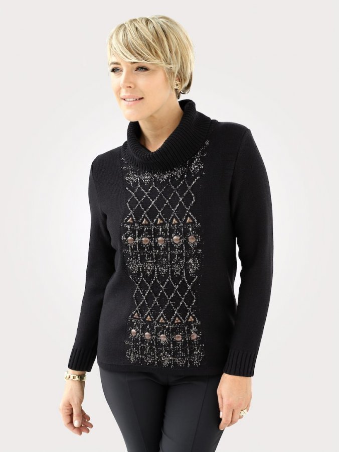 MONA-merkkinen neulepusero kauniisti kimaltelevaa kohopintaista neulosta. Etupuolella graafinen kuvio ja somistelaattoja. Selkäpuoli, etupuolen sivut ja hihat nurjaa neulosta. Viehättävä, väljä poolokaulus. Runsaasti puuvilla sisältävää, erittäin pehmeää ja miellyttävän tuntuista materiaalia.