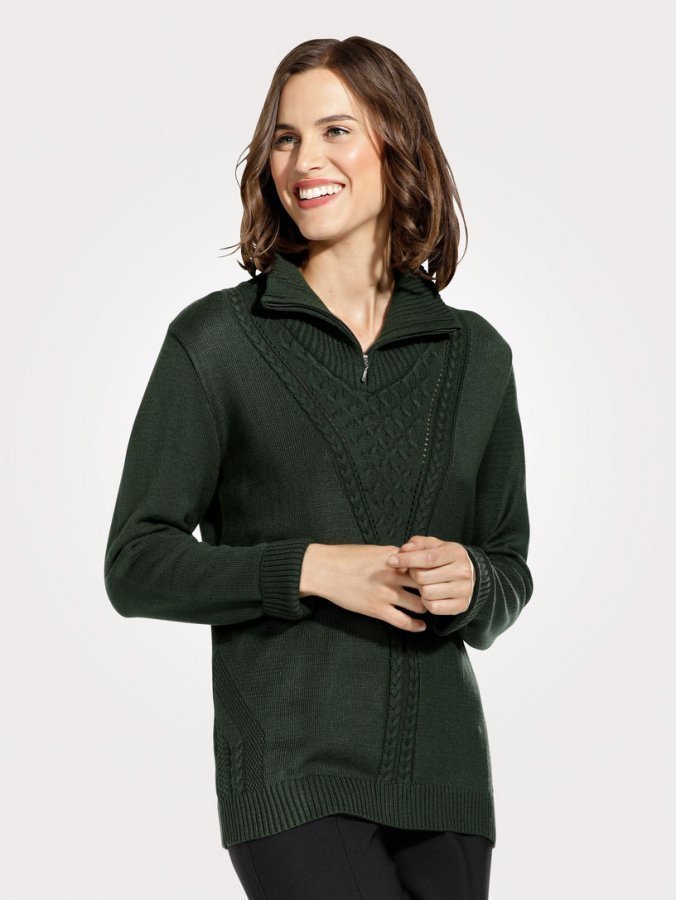 Ihanan pehmeä MONA-merkkinen neulepusero, jonka etupuolella kohokuvio- ja palmikkoneulosta. Sporttisen ilmeen luova vetoketjukaulus joustinneulosta. Selkäpuoli ja pitkät hihat sileää neulosta. Ihoystävällistä, kutittamatonta, silkinhienoa materiaalia.
