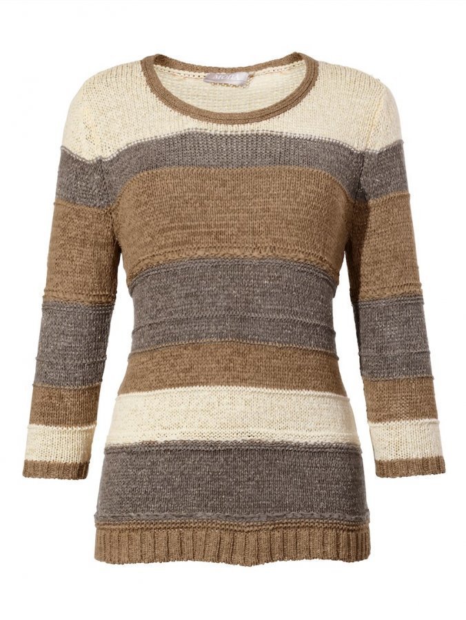Näyttävä sekoitus eri materiaaleja sekä neulostekniikoita! Tämä urheilullinen, 3/4-hihainen neulepusero on valmistettu kimalle- ja nauhalangasta. Pukeudut siihen usein ja mielelläsi! Katseet kääntyvät etu- ja takaosan raitakuviointiin. Muotikesän uusi suosikki!