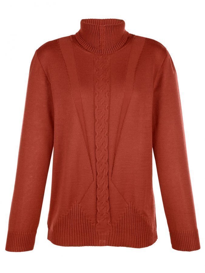 Pehmeä, MONA-merkkinen neulepusero sisältää merino-villaa. Poolokaulus lämmittää myös viileinä päivinä. Etuosassa palmikko- ja kohoneulosta. Joustinneuleisessa kauluksessa on myös palmikkukuviointia.