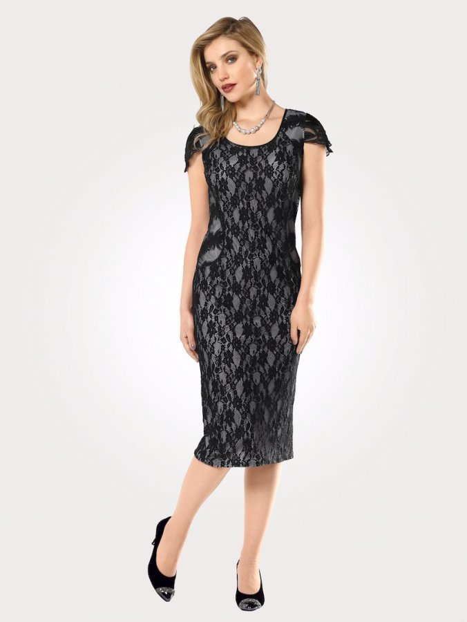 MONA-merkkinen mekko, jonka kauniisti hohtava vaalea neulosvuori tuo filigraanityylisen kukkapitsin upeasti oikeuksiinsa. Vartalon muotoa korostava höyhenkirjottu sivukaitale. Käyttömukavuuden varmistava joustava pitsi ja joustava vuori. Viehättävät, muotoon leikatut siipihihat. Selkäpuolella nappi ja kiinnityssilmukka sekä liikkumavaraa lisäävä halkio.