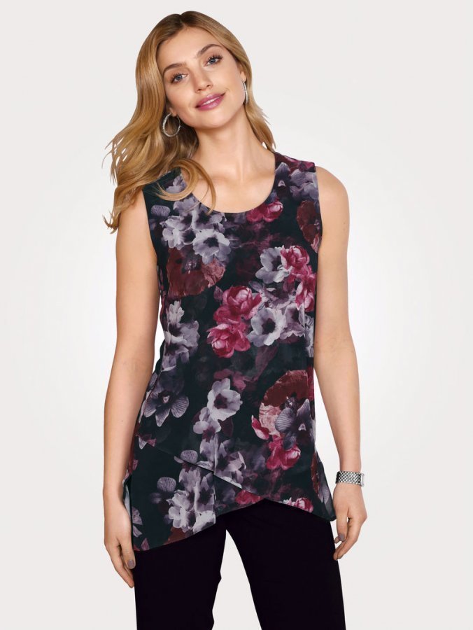 MONA-malliston pitkähelmainen toppi. Kaunis väriyhdistelmä tuo kukkapainatuksen upeasti esiin. Jokainen toppi on kuosiltaan uniikki. Malli on kevyesti läpikuultavaa ja ilmavaa kreppi-georgettea. Miellyttävä, vuoriton jerseytoppi istuu hyvin helman halkioiden ansiosta. Selässä lenkki ja nappi.