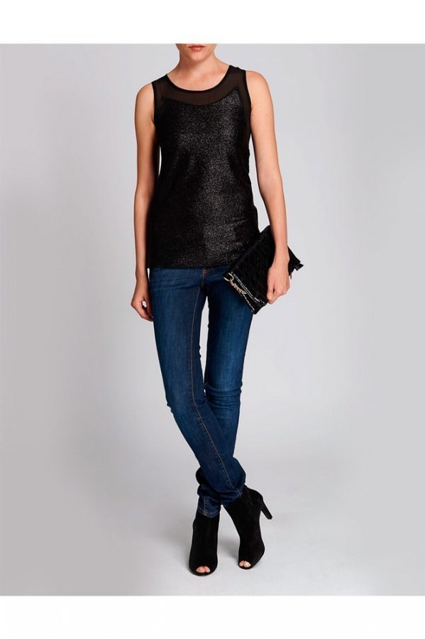 Toppi, suora malli. Pyöreä pääntie. Leveät olkaimet. Hohtavaa materiaalia, jossa metallilankaa. 77% viskoosia, 13% metallilankaa, 10% polyesteriä Istuvuus: regular Pesu 30°.