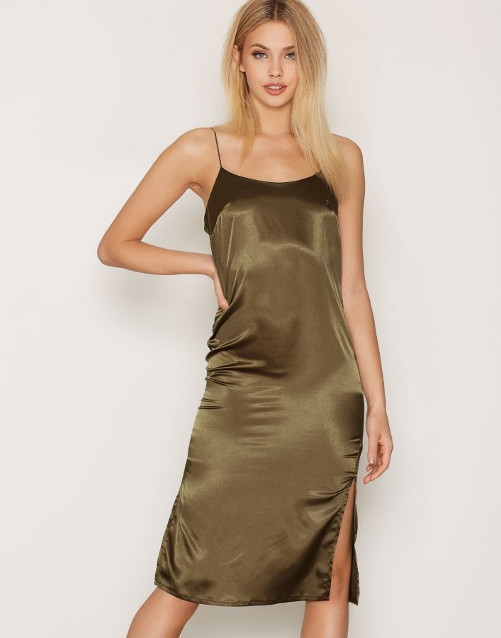 NLY One -mekko. Suora malli satiinityylisestä materiaalista. Sivuhalkiot. Kapeat, pyöreät olkaimet. Valmistettu 97 % polyesterista ja 3 % elastaanista. Tuotenumero: 133613-0243. Väri: Khaki. Kategoriaryhmä: Vaatteet / Juhlamekot / Kotelomekot. Koot: X-Small, Small, Medium, Large, X-Large. Kohderyhmä: Naiset.