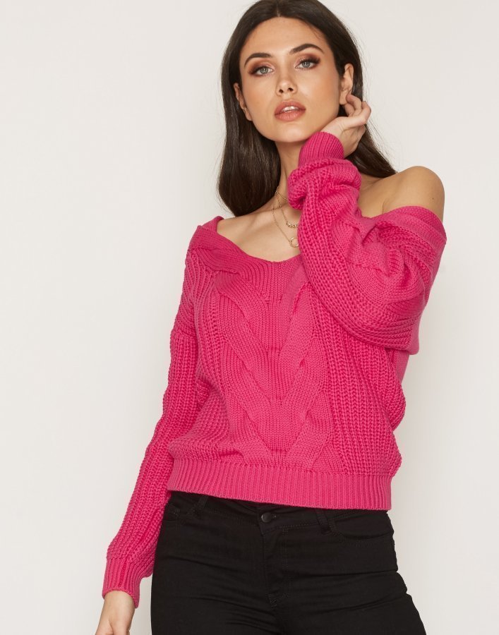 NLY Trend off-shoulder mallinen neulepusero. Palmikko neulottu edestä ja hihoista. Resori alhaalla ja hihansuissa. Valmistettu 100 % Puuvillasta. Tuotenumero: 390150-0484. Väri: Fuchsia. Kategoriaryhmä: Vaatteet / Puserot / Neulepuserot. Koot: Small, Medium, X-Large, X-Small, Large. Kohderyhmä: Naiset.