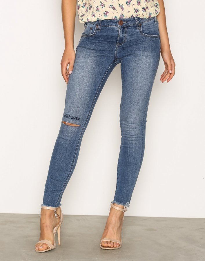 One Teaspoon farkut. Viisitaskumalli korkealla vyötärölllä. Suljetaan napilla ja vetoketjulla. Vyölenkit ja huolittelemattomat reunat lahkeissa. Brodeerattu teksti edessä. Valmistettu 73 % Puuvillasta, 20 % Polyesterista, 5 % Viskoosista ja 2 % Elastaanista. Tuotenumero: 150388-0989. Väri: Blue. Kategoriaryhmä: Vaatteet / Farkut / Slim. Koot: W25, W27, W28, W29, W30, W24, W26, W31. Kohderyhmä: Naiset.