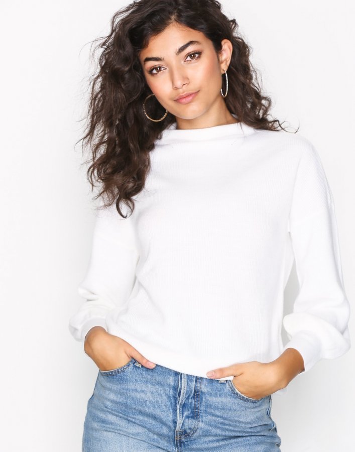 Only neulepusero. Puolipoolo ja ribbineulotut reosrit hihansuissa ja helmassa. Ilmapallohihat. Valmistettu 100 % Akryylista. Tuotenumero: 64864-0001. Väri: Valkoinen. Kategoriaryhmä: Vaatteet / Puserot / Neulepuserot. Koot: X-Small, Small, Medium, Large, X-Large. Kohderyhmä: Naiset.