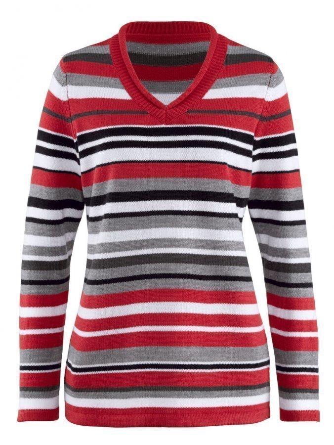 Tyylikäs neulepusero, jossa on kaunis raitakuosi. Taitekaulus ja V-pääntie.