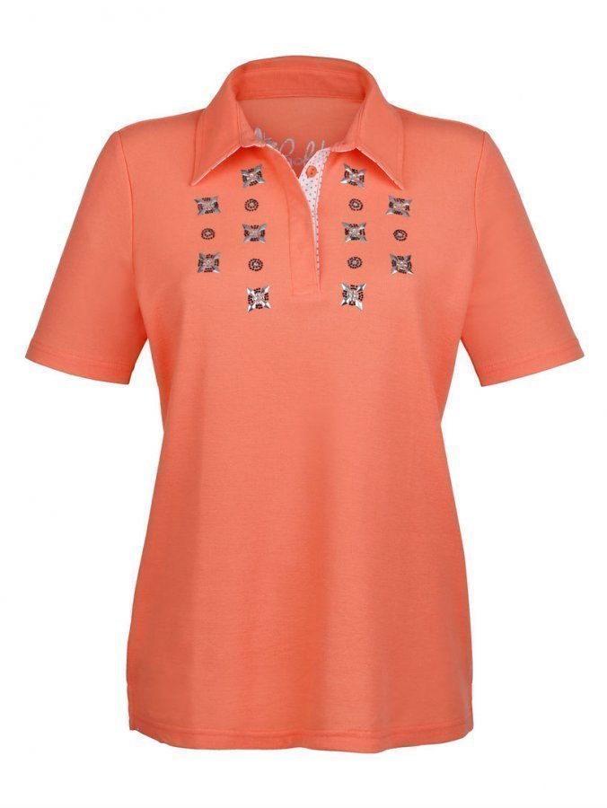 Sporttinen pikeepaita, jonka etuosassa on upeita koristekivikuvioita. Pilkullinen kauluksen ja nappilistan sisäpinta.