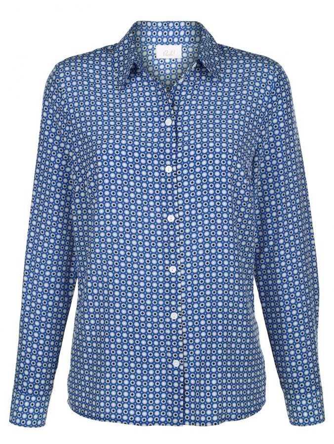 Pusero, jossa on kaunis höyhenkuviointi. Paitakaulus ja nappilista. Pitkät hihat, joissa on napilliset mansetit. Suora helma.