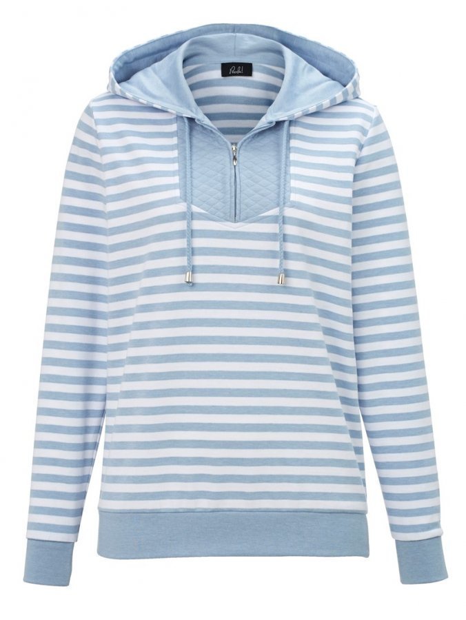 Raidallinen svetari, jonka etupuolella tikattu somiste. Pääntiessä lyhyt vetoketju. Hupussa nauhakuja ja kiristysnauha. Helma ja hihansuut yksiväriset. Suora malli.