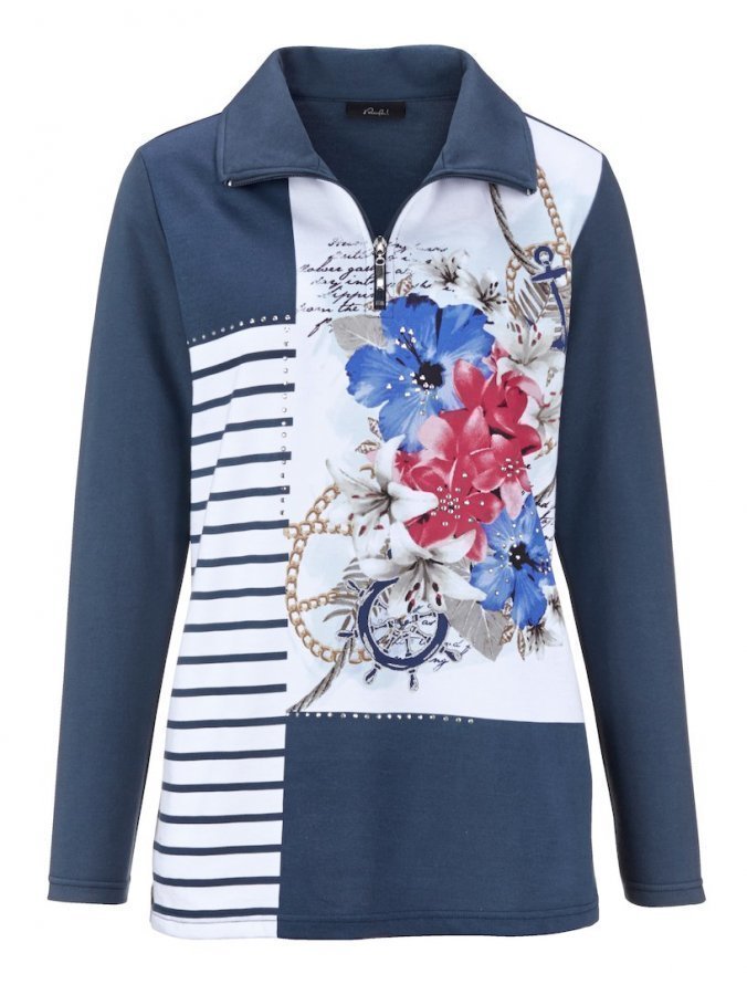 Mukava kukkakuvioitu svetari, jonka etuosa on koristeltu strassikivillä.