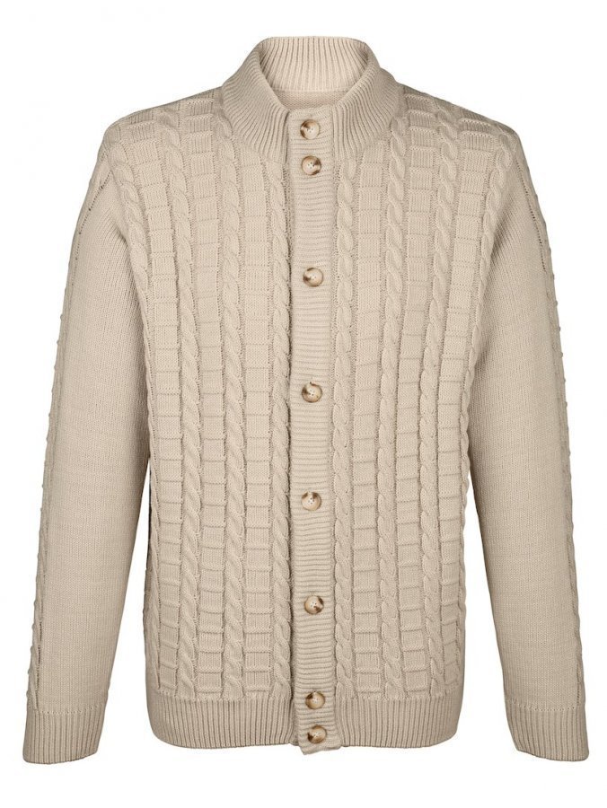 Neuletakki, jossa on pystykaulus ja täyspitkä nappilista. Etuosassa ja hihoissa kuvioneulosta. Hihansuissa ja helmassa joustinneulosresorit.