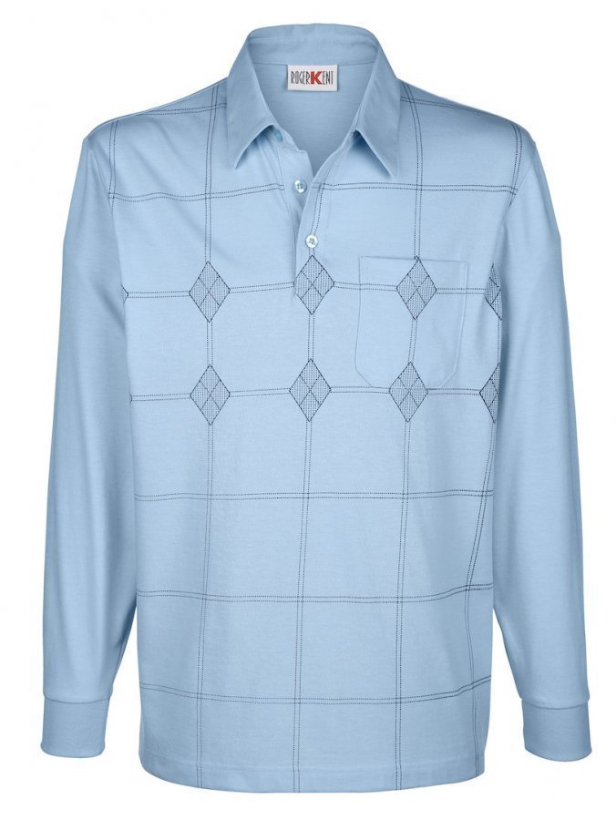 Pitkähihainen paita, jossa paitakaulus ja kolmen napin nappilista. Miehustassa tehostevärinen painokuviointi ja päälle ommeltu rintatasku. Hihansuissa joustavat resorit. Suora helma.