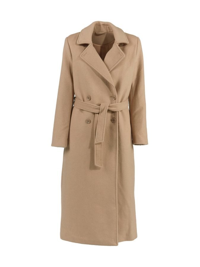 Pitkänmallisessa takissa on klassinen kaksirivinapitus sekä solmittava vyö vyötäröllä. Sisäpuolella on sileäpintainen vuori ja napillinen povitasku. Syksyn ja talven näyttävä valinta.