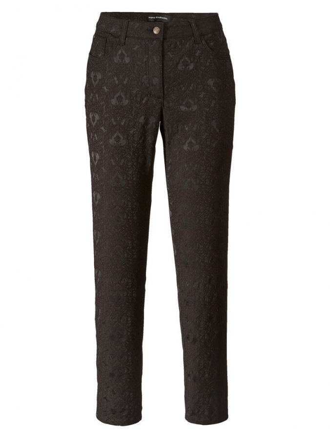Tyylikkäät housut, joissa jakardikuvioitua pitsiä. Herkkä pitsi yhdistettynä sporttiseen 5-taskumalliin tekee vaikutuksen. Suosittu slim fit -leikkaus, jossa on kapeat lahkeet. Mukavasti joustavaa materiaalia.