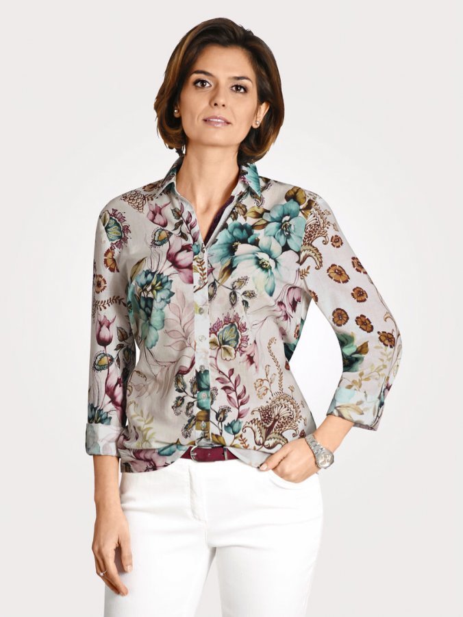 Raikkaasti kukkakuvioitu SE JUST WHITE -merkkinen pusero ilmavan kevyttä, puhdasta puuvillaa. Nappilista, nauhasomisteinen avoin V-pääntie ja paitakaulus. Pitkissä hihoissa kalvosimet. Käännettävät hihat, jotka voidaan kiinnittää ylös tampilla ja napilla.