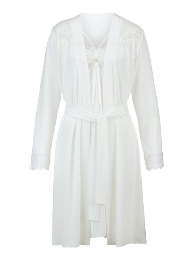 Settiin sisältyy aamutakki ja yöpaita. Aamutakissa on olkapäillä ja hihansuissa joustavaa pitsiä, vyölenkit ja sidottava vyö. Pituus n. 100 cm. Yöpaidassa on poven seudulla joustavaa pitsiä, etuosassa rypytystä ja takaa säädettävät olkaimet. Pituus n. 95 cm.
