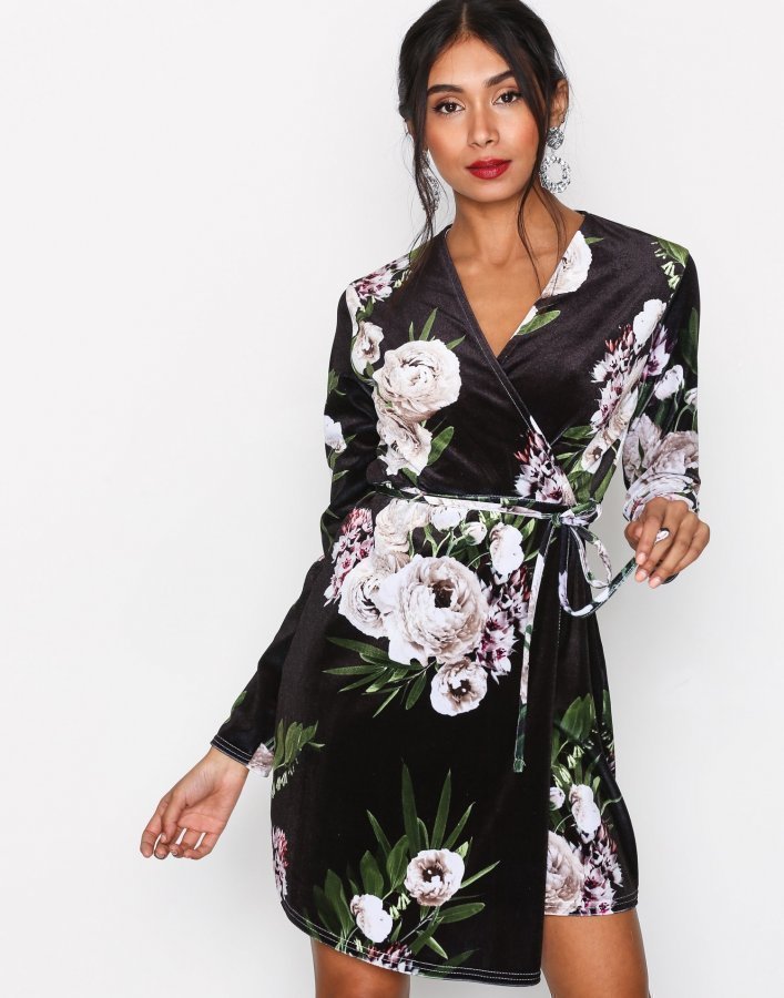 Sisters Point kuvioitu mekko. Pitkähihainen malli kietaisulla edessä, kinnitys naruilla. Vyötäröresori. Valmistettu 96 % Polyesterista ja 4 % Elastaanista. Malli: Malli on 154 cm pitkä ja käyttää kokoa X-Small. Tuotenumero: 914769-0426. Väri: Black. Kategoriaryhmä: Vaatteet / Juhlamekot / Kotelomekot. Koot: X-Small, Small, Medium, Large, X-Large. Kohderyhmä: Naiset.