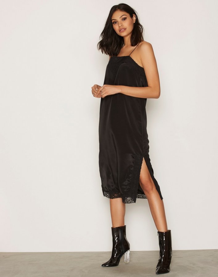 Sisters Point -mekko. Suora malli ohuilla, pyöreillä olkaimilla. Pitsiyksityiskohdat sekä halkiot sivuhelmoissa. Valmistettu 100 % polyesterista. Tuotenumero: 914548-0426. Väri: Black. Kategoriaryhmä: Vaatteet / Mekot / Loose fit dresses. Koot: X-Small, Small, Medium, Large, X-Large. Kohderyhmä: Naiset.