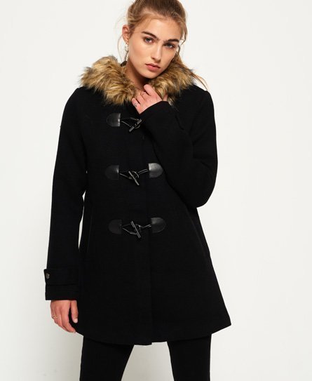 Naisten Superdry Brooklyn -duffelitakki. Moderni tulkinta perinteisestä hupullisesta duffelimallisesta takista. Takissa on painonappikiinnitteinen irrotettava tekoturkissomiste hupussa, nyörinappi- ja vetoketjukiinnitys edessä, kaksi etutaskua ja painonapilliset säädettävät hihansuut. Brooklyn-duffelitakissa on loppusilauksena hillitty metallinen Superdry-logomerkki hihassa. Mallin päällä oleva koko: Small Mallin pituus: 173 cm Mallin rinnanympärys: 84 cm tiukka istuvuus