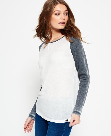 Superdry Contrast Waffle -baseballpaita naisille. Pitkillä, kontrastivärisillä olkahihoilla varustettu paita, jossa on pyöreä kaula-aukko ja sen alla V:n muotoinen koristeommel. Helmassa on loppusilauksena Superdry-logolappu.