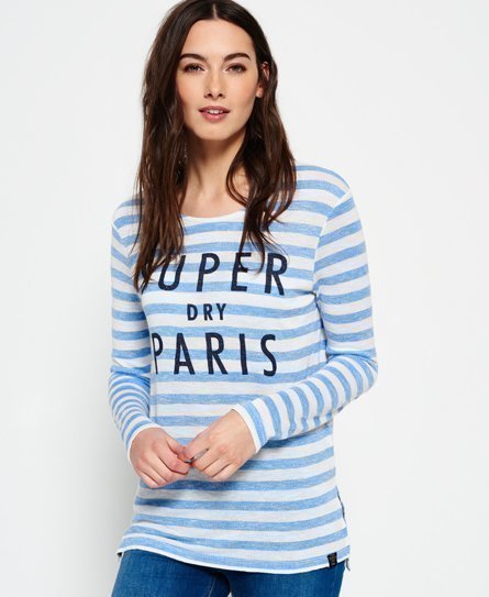 Superdry Nautical Step Hem -pusero naisille. Merihenkinen, ylisuuri pitkähihainen, jossa on Superdry-painatus rinnassa sekä portaittainen helma, jota koristaa Superdry-logo. Mallin vaatekoko: S Mallin pituus: 181 cm