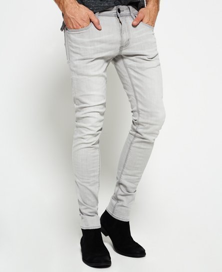 Miesten Superdry-pillifarkut. Piukat farkut, joissa on perinteiseen tapaan viisi taskua ja vetoketjusepalus. Housuissa on Superdry-logomerkki sekä logokirjailu kolikkotaskussa. Napeissa ja nastoissa on Superdry-merkkikuviointi ja toisessa takataskussa Superdry-logomerkki.